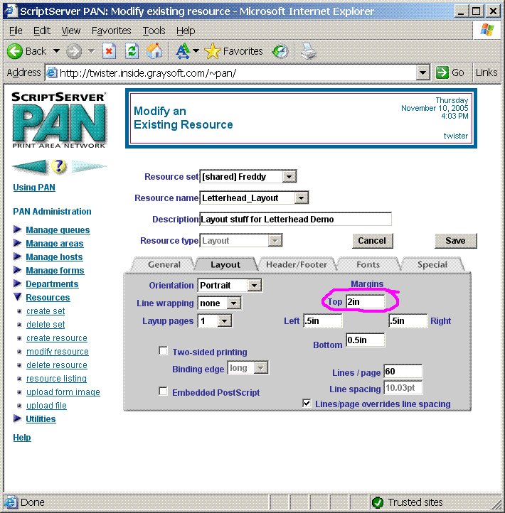 The layout resource will control the placement of text on the printed pages; it will have no effect when printing PostScript jobs. In particular, the top margin will control how much room is left on the first page for the letterhead, without overprinting (you can if you wish use a full-page image, with some of it serving as a background watermark). In this example we have left 2 inches at the top of the page for the letterhead.