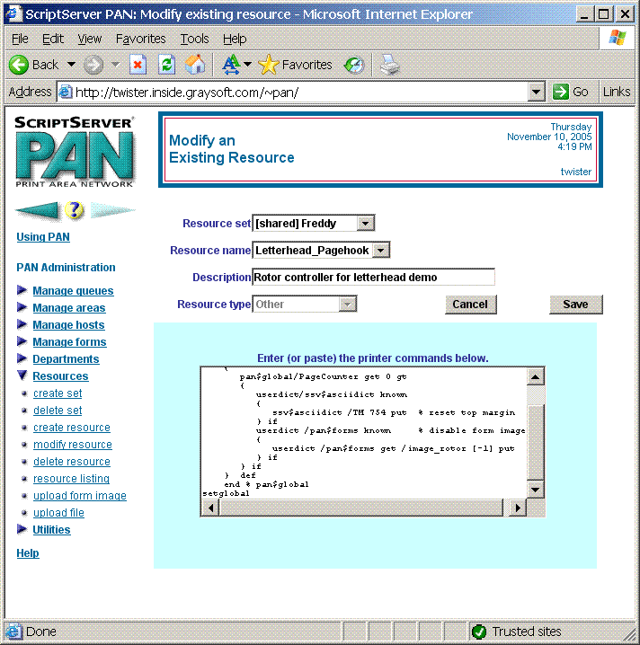 The rotor controller is a PostScript snippet whose functionality is tied to specific capabilities of the PostScript which is generated by the ScriptServer PAN Printing System. It is a resource of type Other, and in this case it serves to: